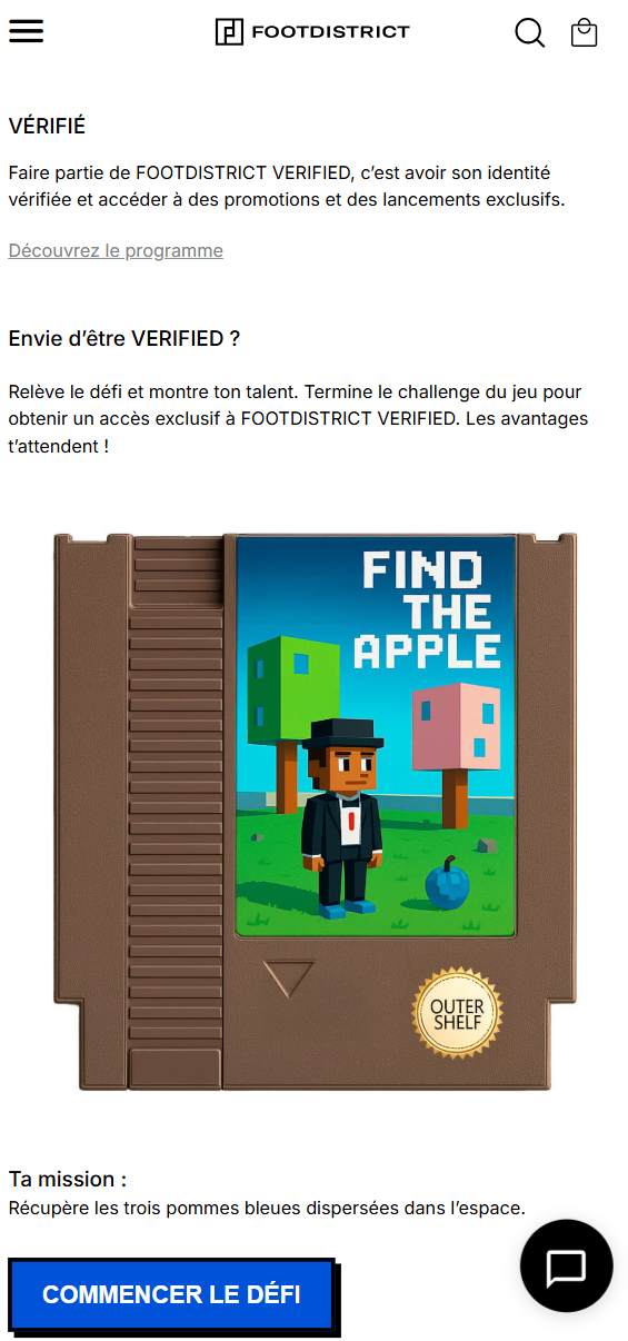 Dans l’espace VERIFIED de votre compte client, vous trouverez un défi à relever. Accomplissez la mission proposée pour obtenir un accès exclusif à FOOTDISTRICT VERIFIED.